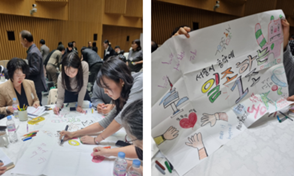 | 퍼실리테이터와 함께 분임토의를 하고 분임별 이름과 다짐을 적는 작업을 하고 있다 |