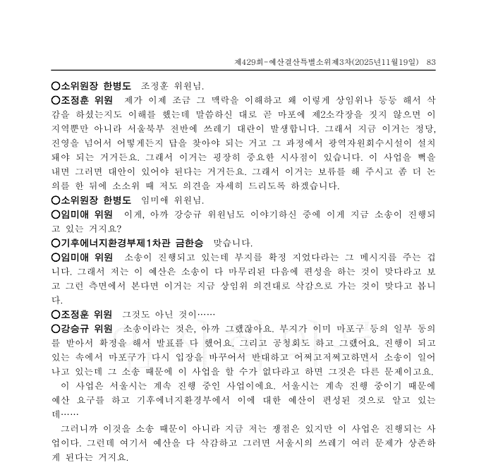 조 의원은 돌연 "이 사업을 뼉을 내면(무산시키면) 대안이 있어야 한다"라며 "마포에 제2소각장을 짓지 않으면 서울 북부 전반에 쓰레기 대란이 발생한다"라고 삭감 반대 논리를 폈다. 불과 몇 분 전 "삭감 동의"를 외치던 입에서 나온 말이라고는 믿기 힘든 논리 전개였다.