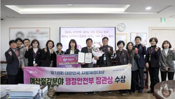 마포구는 12월 17일, 행정안전부가 주관한 ‘제18회 대한민국 지방재정대상’에서 예산절감 분야 행정안전부 장관상을 수상하고 인센티브로 특별교부세 1억 원을 확보했다.