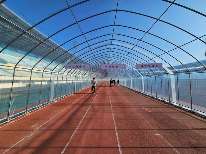 동계맞춤형 육상트랙은 기존 종합운동장 육상트랙을 그대로 활용해 조성됐다. 총 400m 길이의 트랙 전 구간에 비닐터널을 설치해 눈과 비, 바람을 차단했고, 6개 레인은 달리기 전용(1~4레인)과 걷기 전용(5~6레인)으로 구분해 이용자 간 충돌을 최소화했다. 별도의 대규모 시설 신설이 아닌, 기존 인프라의 활용도를 높인 점이 특징이다.