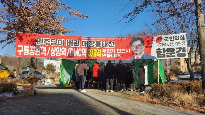 이날 현장에는 “민주당이 버린 대장홍대선, 3개 역은 우리가 반드시 만들겠다”는 강한 어조의 현수막이 내걸렸다.