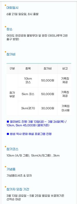 대회 종목은 10km와 5km 코스(기록칩 제공), 그리고 가족 단위 참여가 용이한 3km 걷기(기록칩 미사용)로 나뉜다. 참가자 전원에게는 기념 티셔츠와 모자가 제공되며, 현장에서는 밤섬의 역사와 문화를 직접 들을 수 있는 해설 프로그램도 함께 운영된다.