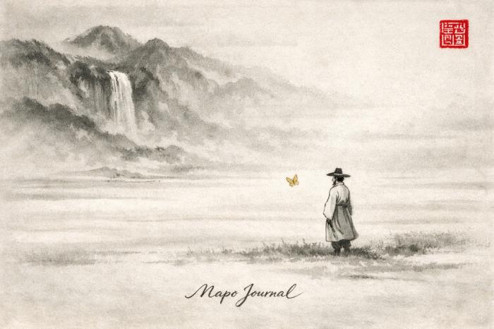 전통적인 대한민국 수묵화 스타일의 그림으로, 미니멀하고 사색적이며 여백의 미를 살린 신비로운 분위기를 담고 있다. 저 멀리 폭포가 흐르는 산이 보이며 광활하고 텅 빈 평원 위에 한 남성이 갓을 쓰고 한복을 입은채 아주 멀리 홀로 서 있으며 작게 보인다., 그는 곁에서 섬세하게 날아다니는 노란색을 가진 나비를 넋을 잃은 듯 바라보고 있다. 그 장면은 부드럽고 확산된 빛 속에서 고요하면서도 약간의 쓸쓸함이 느껴지며, 빛과 그림자의 미묘한 대비를 통해 한국 전통 예술의 정수를 아름답게 표현하고 있습니다. 이미지의 상단 우측에는 작품의 인주가 찍혀져 있습니다. 아래에는 [Mapo Journal]이 가운데에 필기체로 쓰여져있다