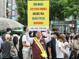 박강수 마포구청장은 8월 17일 오후 5시, 홍대입구역 인근 ‘레드로드’ 구간에서 대장~홍대 광역철도 홍대입구역(111정거장) 역사 위치 변경을 촉구하는 1인 시위 릴레이의 첫 주자로 나섰다.이날 박 구청
