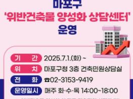 마포구는 구민의 재산권 보호와 경제적 부담 경감을 위해 7월부터 ‘위반건축물 양성화 상담센터’를 운영한다.이는 2025년 5월 19일 자 서울특별시 도시계획조례 개정으로 2028년 5월 18일까지 한시적으로