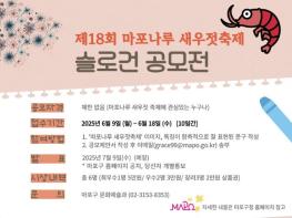 마포구는 10월 17일부터 19일까지 개최되는 ‘제18회 마포나루 새우젓축제의 공식 슬로건을 선정하기 위한 슬로건 공모전을 6월 18일까지 진행한다.이번 공모는 지역 주민의 자발적인 참여와 관심을 이끌어