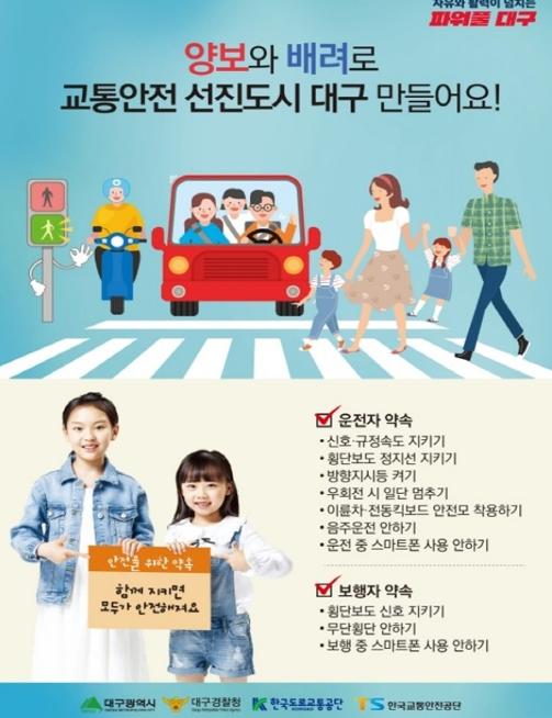 허준석 대구광역시 교통국장은 “교통사고는 무단횡단 금지, 보행안전 수칙 준수와 같은 교통질서를 지킴으로써 예방할 수 있다고 생각한다”며, “운전자 및 보행자 모두 양보와 배려로 교통안전 선진도시 대구가 될 수 있도록 시민들의 적극적인 협조를 당부드린다”고 말했다.