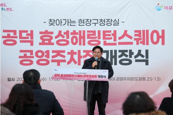 박강수 마포구청장은 12월 3일 오후 5시, 공덕역 10번 출구 앞 광장에서 열린 ‘공덕 효성해링턴스퀘어 공영주차장 개장식’에 참석해 시설 개장을 축하했다.
