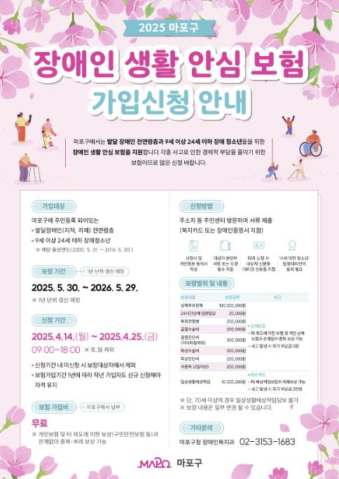 ’장애인 생활 안심 보험‘ 관련 자세한 사항은 마포구청 누리집 ’공지사항‘란을 참고하거나 주소지 동주민센터 또는 장애인복지과로 문의하면 안내받을 수 있다.