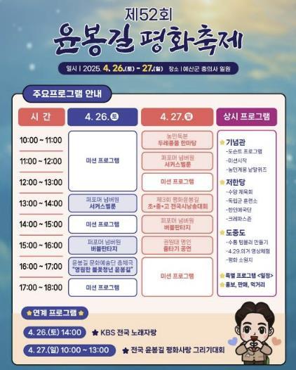 주요 프로그램으로는 윤봉길 의사의 평화 여정을 따라가는 6단계 미션 프로그램과 지역 로컬크리에이터 ‘고로컬’과 협업한 도슨트 프로그램이 운영되며, 그리기대회, 시낭송대회 등 경연 프로그램과 버블쇼, 명인 줄타기 공연 등 다양한 볼거리도 마련된다.