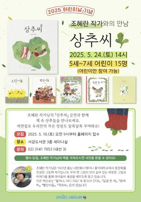 먼저, 5월 24일에는 그림책 ‘상추씨’의 조혜란 작가를 초청해 '작가와의 만남' 행사가 열린다. 행사 당일 조혜란 작가의 책을 가져오면 현장에서 직접 사인을 받을 수 있는 특별한 시간도 열린다.