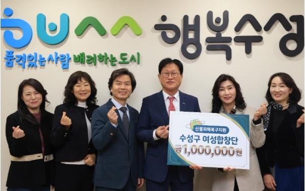 대구시 수성구여성합창단(회장 성언주) 단원들이 14일 수성구청을 방문해 산불 피해 지역 주민들을 돕기 위한 성금 100만 원을 전달했다.