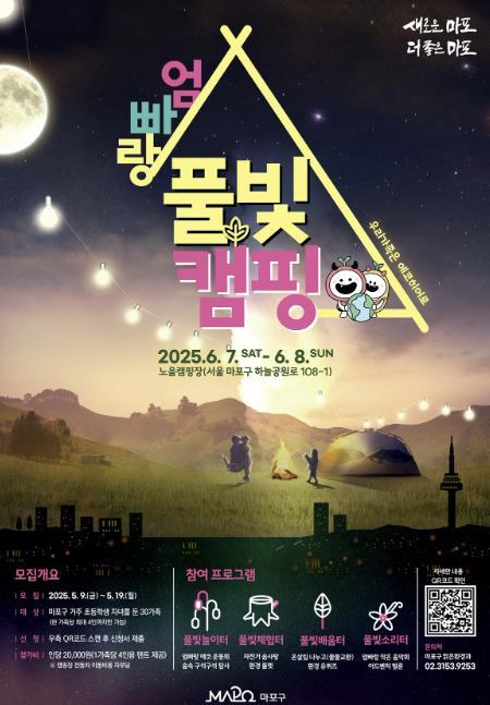 마포구는 환경의 달 6월을 맞아 관내 초등학생 자녀를 둔 가족을 대상으로 ‘마포 엄빠랑 풀빛캠핑’ 참가자를 5월 19일까지 모집한다.