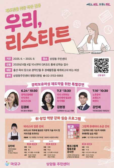이 가운데 상암동 주민센터는 출산과 육아 등으로 인해 경력이 단절된 경력보유여성들의 경제활동 재개를 돕기 위한 ‘우리, 리스타트’ 사업을 오는 6월부터 9월까지 운영한다.