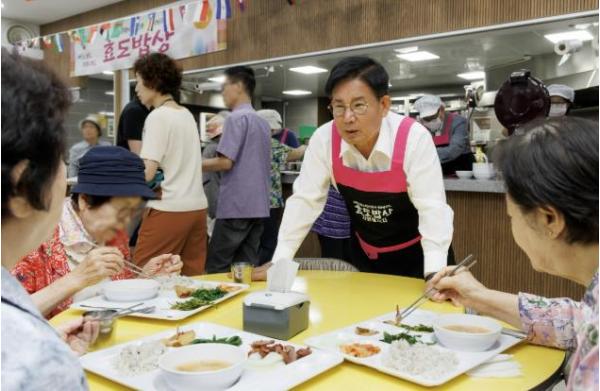 하루 평균 2,000명의 어르신이 이용하는 ‘효도밥상’은 개인과 기관, 단체 등의 후원과 자원봉사로 운영되는 저비용·고효율 복지 모델로, 누적 후원금은 22억 원에 달한다.
