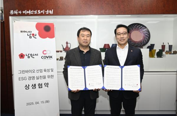 남원시는 지난 15일, 시청에서 화장품 전문기업 ㈜코빅스와 함께 그린바이오 산업 육성과 ESG 경영 실천을 위한 상생협약을 체결했다.