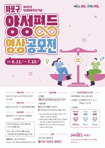 마포구는 다가오는 양성평등주간(9.1. ~ 9.7.)을 기념하는 ‘양성평등 영상 공모전’을 7월 10일까지 개최한다.