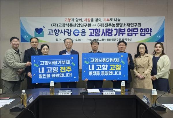 (재)전주농생명소재연구원과 (재)고창식품산업연구원은 15일 고창식품산업연구원 2층 세미나실에서 고향사랑기부제 활성화와 지자체 출연기관 간 네트워크 교류 협력 강화를 위한 협약을 체결했다.