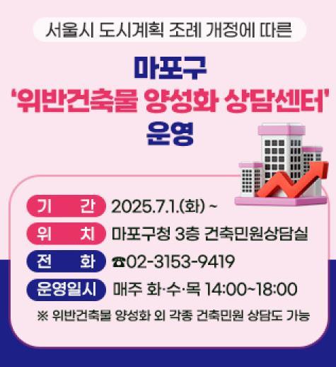 마포구는 구민의 재산권 보호와 경제적 부담 경감을 위해 7월부터 ‘위반건축물 양성화 상담센터’를 운영한다.