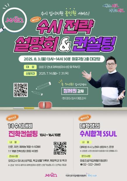 수시 전략 설명회는 300명, 1:1 진학상담은 75명 선착순으로 모집한다. 참여 신청은 7월 14일부터 마포구청 누리집 또는 홍보문 큐알(QR)코드를 통해 할 수 있다.