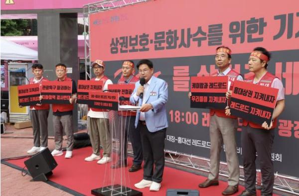 기자회견은 홍대에서 오랫동안 활동해온 예술인 강병수 씨의 사회로 진행됐으며, 이어 박강수 마포구청장을 비롯해 상인 대표, 지역 주민 대표, 예술인 대표가 차례로 반대 성명을 발표했다.