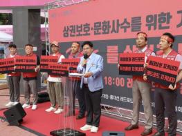 박강수 마포구청장은 7월 31일 오후 6시, ‘레드로드 R2’에서 열린 ‘대장-홍대선 레드로드 역사 설치 반대 비상대책위원회 기자회견’ 현장을 찾아, 대장-홍대선 종착역인 111정거장의 위치 변경을 강하게 요구했다.