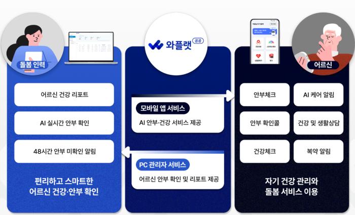 ‘온하나 케어’는 ‘따뜻함(온, 溫)’과 ‘통합(하나)’의 의미를 담은 명칭으로, 와플랫이 개발한 전용 앱을 통해 ▲고독사 예방 ▲건강 모니터링 ▲복약 알림 ▲인지기능 훈련 ▲여가 콘텐츠 제공 등 다양한 통합 돌봄서비스를 지원한다.