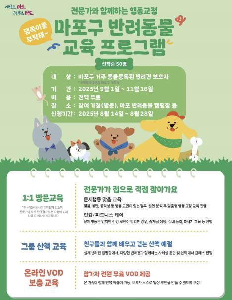 마포구는 반려인의 책임감 있는 양육 문화를 확산하고 유기동물 발생을 방지하기 위해 ‘2025년 반려동물 교육 프로그램’을 오는 9월 1일부터 11월 16일까지 운영한다.