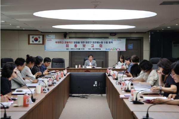 마포구는 지난 5월 자치구 최초로‘입찰 표준매뉴얼 수립 용역’에 착수했다. 이는 입찰 업무의 투명성과 효율성을 높이기 위한 조치로, 구에서 추진한 모든 입찰·계약 현황을 분석하고 개선 방안을 검토해 온 결과물이 이날 보고회에서 공개됐다.