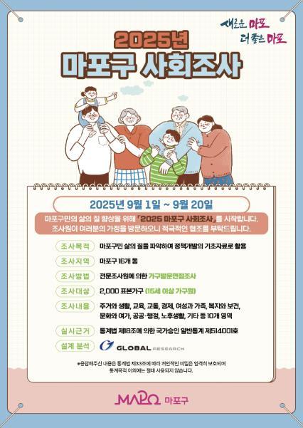마포구는 구민의 주거·복지 등 생활 실태와 정책 수요를 체계적으로 조사·분석해, 향후 구정 운영의 기초자료로 활용하기 위한 ‘2025년 마포구 사회조사’를 오는 9월 1일부터 20일까지 실시한다.