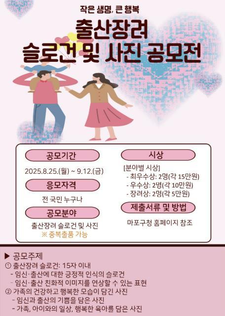 마포구는 임신과 출산에 대한 사회적 관심을 높이고 출산 친화 분위기를 형성하고자 9월 12일까지 ‘출산장려 슬로건 및 사진 공모전’을 개최한다.