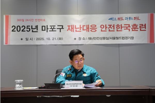 마포구는 10월 21일 오후 2시, 재난안전상황실과 서울월드컵경기장 서문 일대에서 ‘2025년 재난대응 안전한국훈련’을 실시했다.