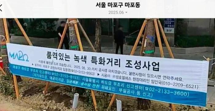 서울환경연합에 따르면, 현장에는 ‘마포구청 공원녹지과’ 명의의 현수막이 설치돼 있었으나, 실제로는 구청의 공식 승인이나 행정 절차 없이 시공사가 자체적으로 게시한 것으로 드러났다는 설명이다. 단체는 이를 두고 “행정기관 사칭에 해당하며, 도시숲법 제12조가 규정한 가로수 관리 절차를 전면 위반한 불법 벌목”이라고 지적했다.