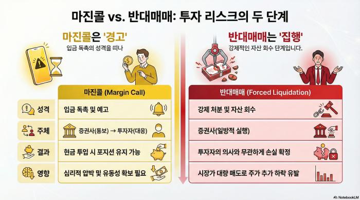 금융 시장에서 '마진콜(Margin Call)'은 투자자가 보유한 자산의 가치가 일정 수준 이하로 떨어졌을 때, 중개기관(증권사 등)이 부족한 증거금을 채워 넣으라고 요구하는 과정을 말한다. 만약 이 요구에 응하지 못할 경우, 투자자의 의사와 상관없이 자산이 강제로 매각되는 '반대매매'가 실행되어 시장에 큰 충격을 주기도 한다.