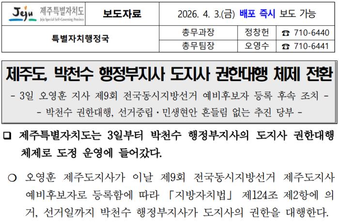 제주특별자치도의 경우도 4월 3일자 보도자료에서 도지사 권한 대행에 대해 밝혔다.