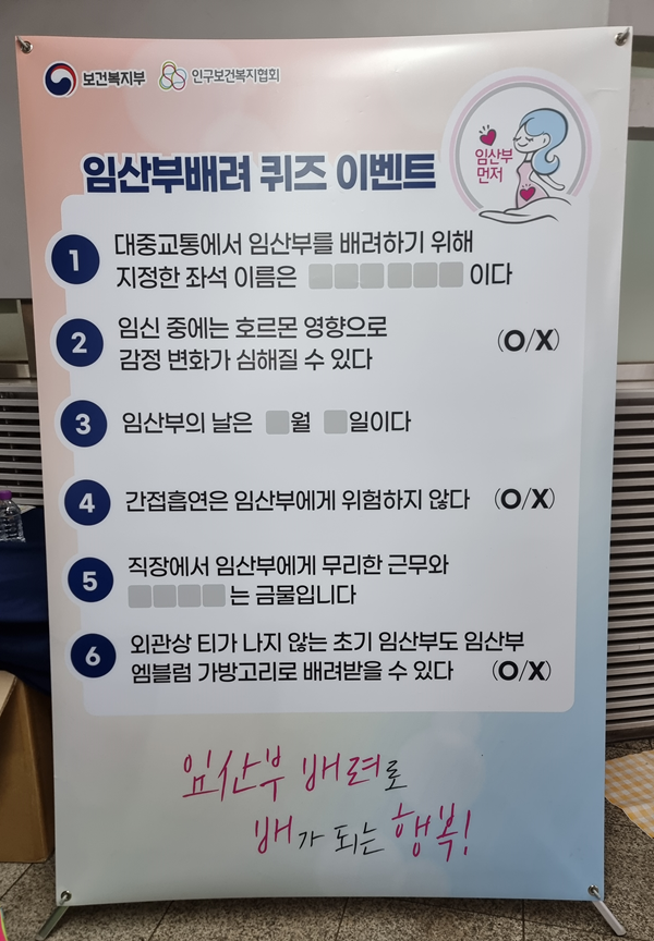 현장에는 임산부 배려석, 간접흡연, 직장 내 보호 규정 등을 주제로 한 퀴즈판이 설치돼 시민들이 직접 참여하며 정책 내용을 자연스럽게 접할 수 있도록 했다. 단순한 홍보를 넘어 생활 속 인식 개선을 유도하는 방식이다.