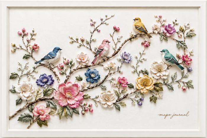 정교한 3D 자수 스타일 일러스트, 부조(bas-relief) 형식의 파이버 아트(fiber art) 효과. 순수한 '실크 화이트와 밀키 화이트' 톤의 배경 위로 섬세한 실크사의 질감이 살아있는 화면. 굽이치는 꽃가지 위에 내려앉은 컬러풀한 작은 새 몇 마리가 묘사되어 있으며, 다양한 색의 꽃과 잎들로 둘러싸여 있다.가볍고 우아한 구도와 여유로운 여백의 미가 돋보임. 가늘고 자연스러운 꽃가지는 겹겹이 쌓인 실의 층으로 입체감을 더한다. 우측 하단에 "mapo journal"필기체.