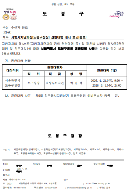 문제는 단순히 ‘이름이 빠졌다’는 형식의 문제가 아니다. 그 빈자리를 무엇으로 채우고 있는지가 더 중요하다. 서울시처럼 권한대행의 이름과 역할을 전면에 내세운 것도 아니고, 그렇다고 현직 구청장의 권한 행사 범위나 행정 운영 방식에 대한 별도의 설명이 있는 것도 아니다. 결과적으로 현재 행정을 책임지는 주체가 누구인지 모호해지는 ‘이름 없는 행정’이 만들어진 셈이다.