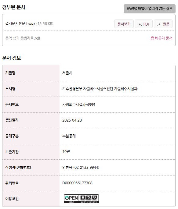 최근 마포 지역 주민들이 모인 오픈 채팅방에는 서울시 공식 홈페이지에서 확인된 한 문서가 공유됐다. 해당 문서는 ‘상암 광역자원회수시설 건립 환경영향평가 용역’과 관련된 준공검사(감독)조서로, 2026년 4월 말 작성된 것으로 나타난다. 문서에는 착공일과 준공일, 담당 부서 및 검사자 등의 정보가 포함돼 있으며, 사업이 일정 단계까지 진행됐음을 시사한다.